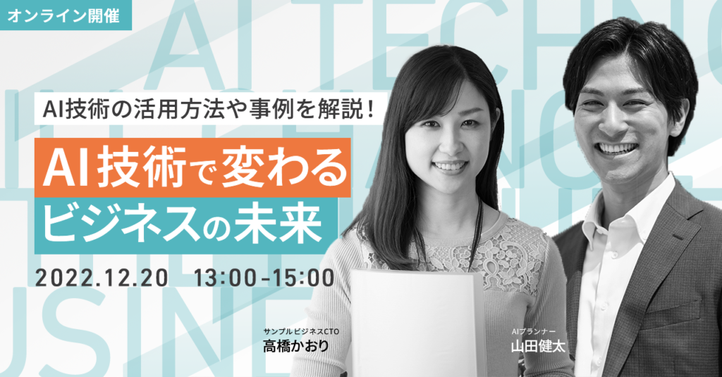 AI技術などの最新情報に関心の高いビジネスパーソンをターゲットとした、オンラインセミナーの告知と集客を目的としたバナー。キーワードが目に入りやすいサイズ感にし、ベーシックなフォントでビジネスとしての堅実さや力強さを表現。爽やかな印象の寒色系でまとめつつ、暖色を入れることで、冷たい印象にならないように工夫。写真を白黒にすることで人の印象を強く出しすぎず、統一感が生まれている。